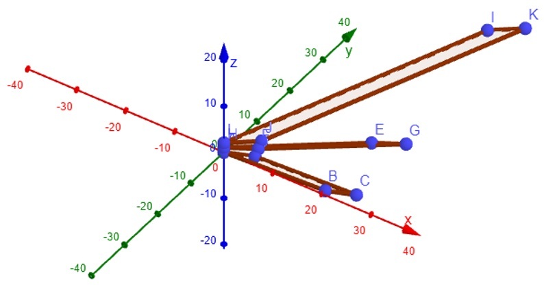 Графическим выражением полученных векторов и матриц будут служить параллелограммы, площадь которых соответствует детерминанту квадратных матриц. Дополнительной координатой может выступать время (этап проекта), в результате параллелограммы будут лежать в разных плоскостях и получится трехмерное изображение, иллюстрирующее динамику метаболизма, рис. 2.