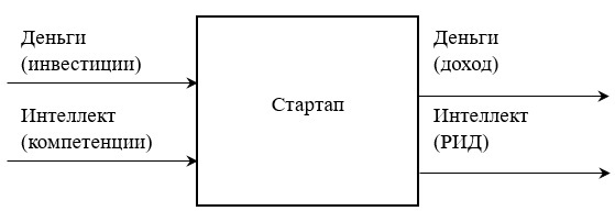Под метаболизмом стартапа или инновационного проекта будем понимать изменение денег и интеллектуальных ресурсов в ходе жизнедеятельности стартапа, рис. 1.